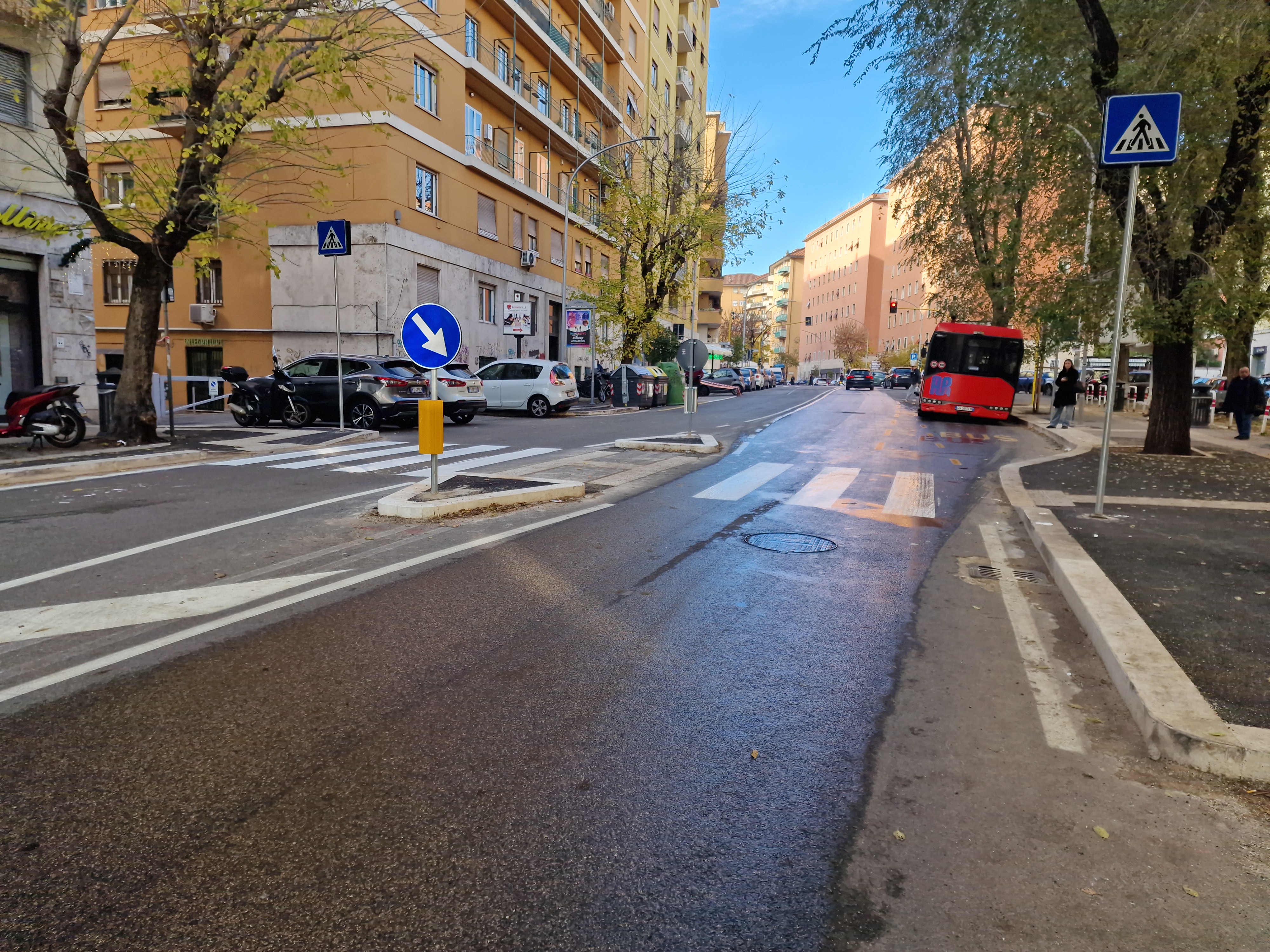 - Allargamento dei marciapiedi in corrispondenza degli attraversamenti di Via Cristoforo Colombo e di Via Padre Semeria. Questi interventi portano ad una migliore definizione delle traiettorie ed ad una diminuzione della lunghezza degli attraversamenti che passano da 32 metri complessivi a 23 m.